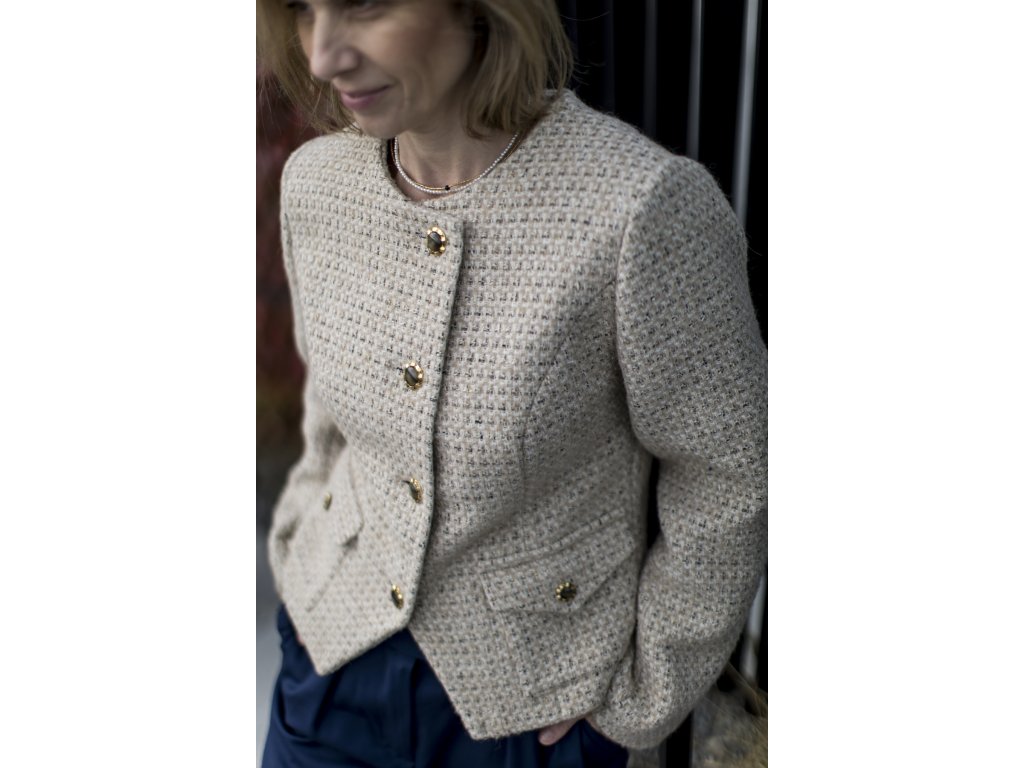 Elegantní krátký vypasovaný kabátek na zapínání z kovových vintage italských knoflíků. Kabátek je z kvalitní látky a la chanel ve složení 70% vlny, 15%bavlny a 15% viskózy. Vpředu kapsičky, podšívka z jemného elastického saténu.