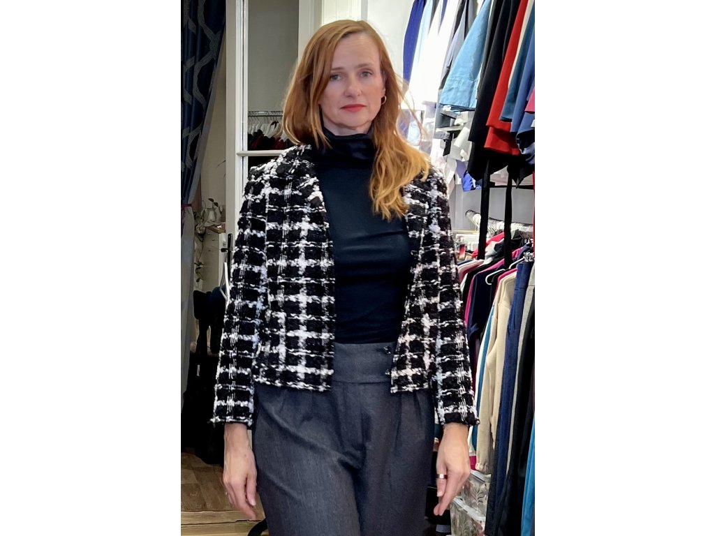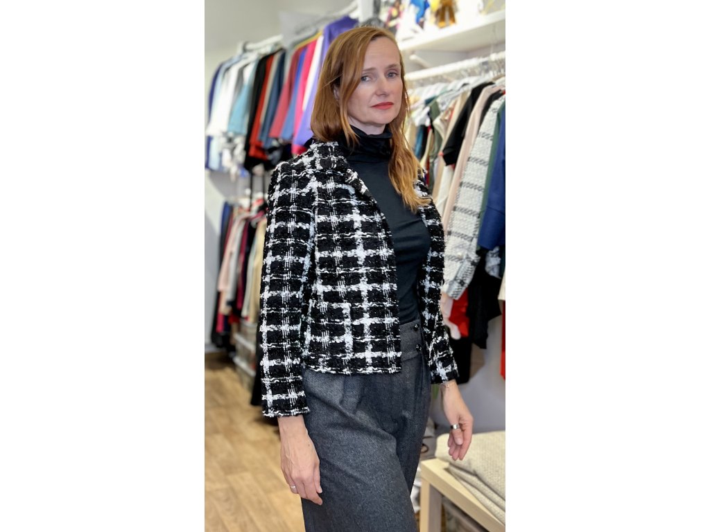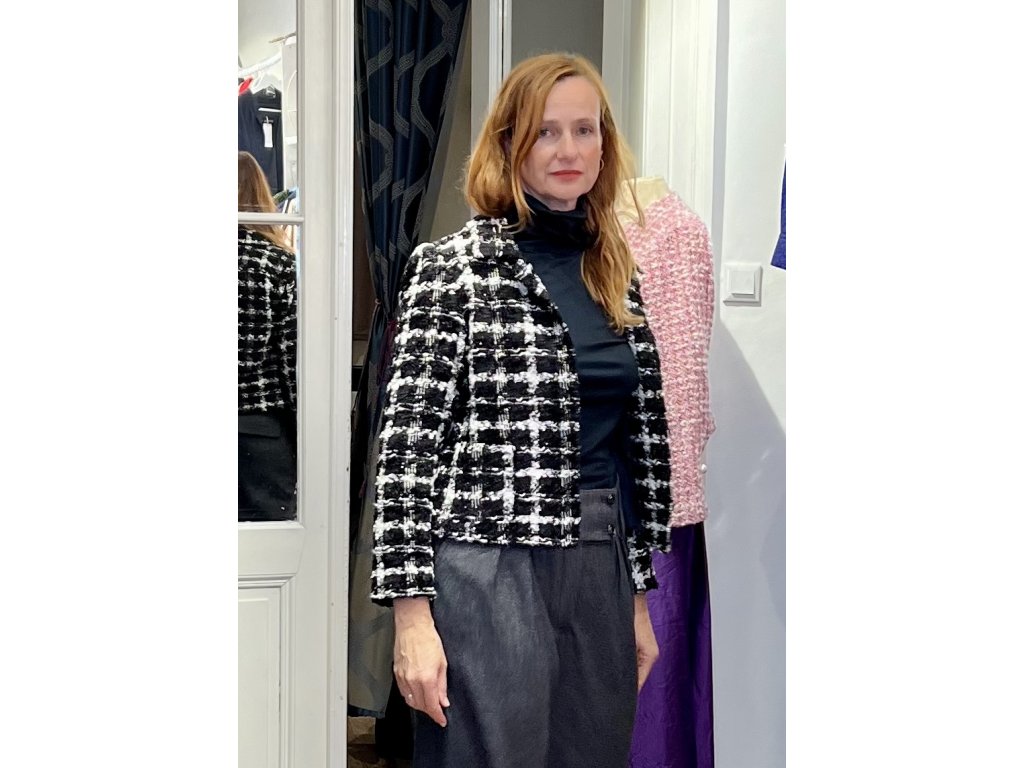 Elegantní krátký vypasovaný kabátek na zapínání zkovových knoflíků. Kabátek je z kvalitní látky a la chanel ve složení 70% bavlna, 20%viskóza a 10% kovové vlákno, vhodný na období jara, lehkého podzimu. Vpředu kapsičky, podšívka z jemného elastického saténu.