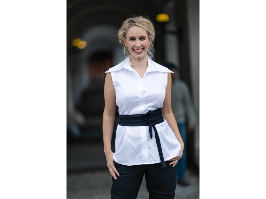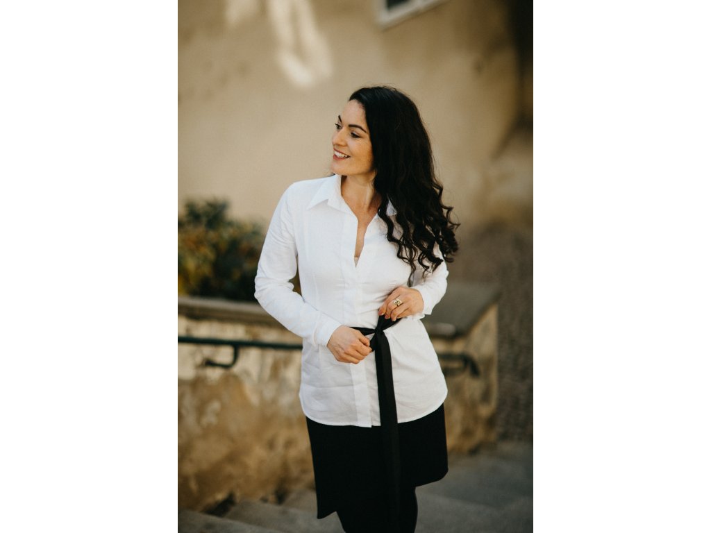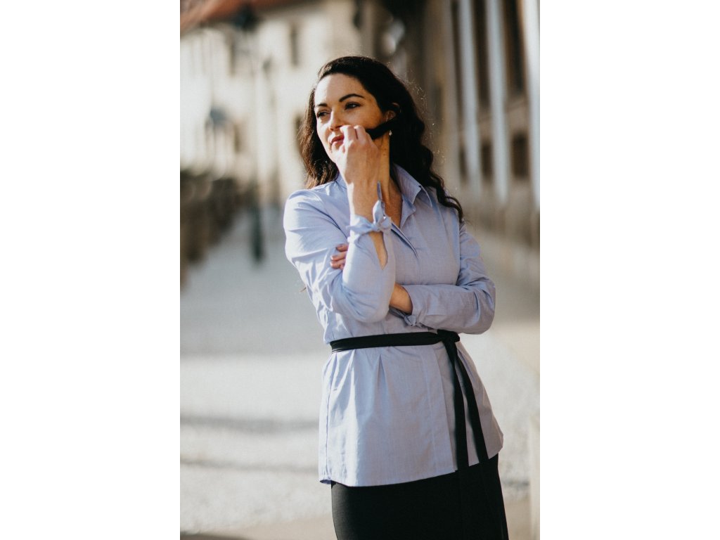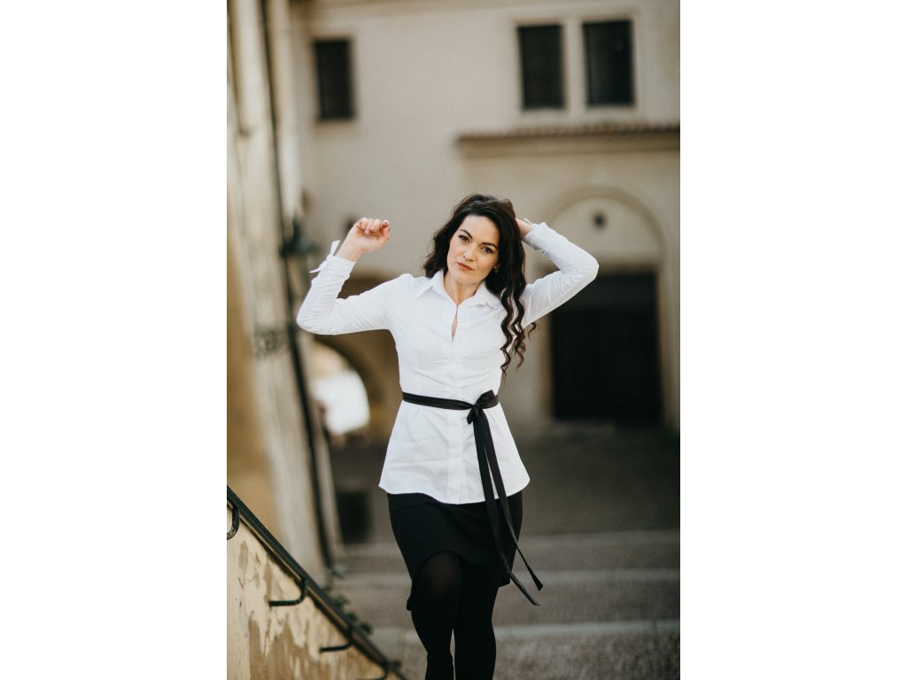 Elegantní delší projmutá halenka se skrytým zapínáním a širokým límcem. Poslední knoflíček je křišťálový. Rukávy jsou dlouhé s manžetou, kterou lze uvázat na elegantní uzlík.