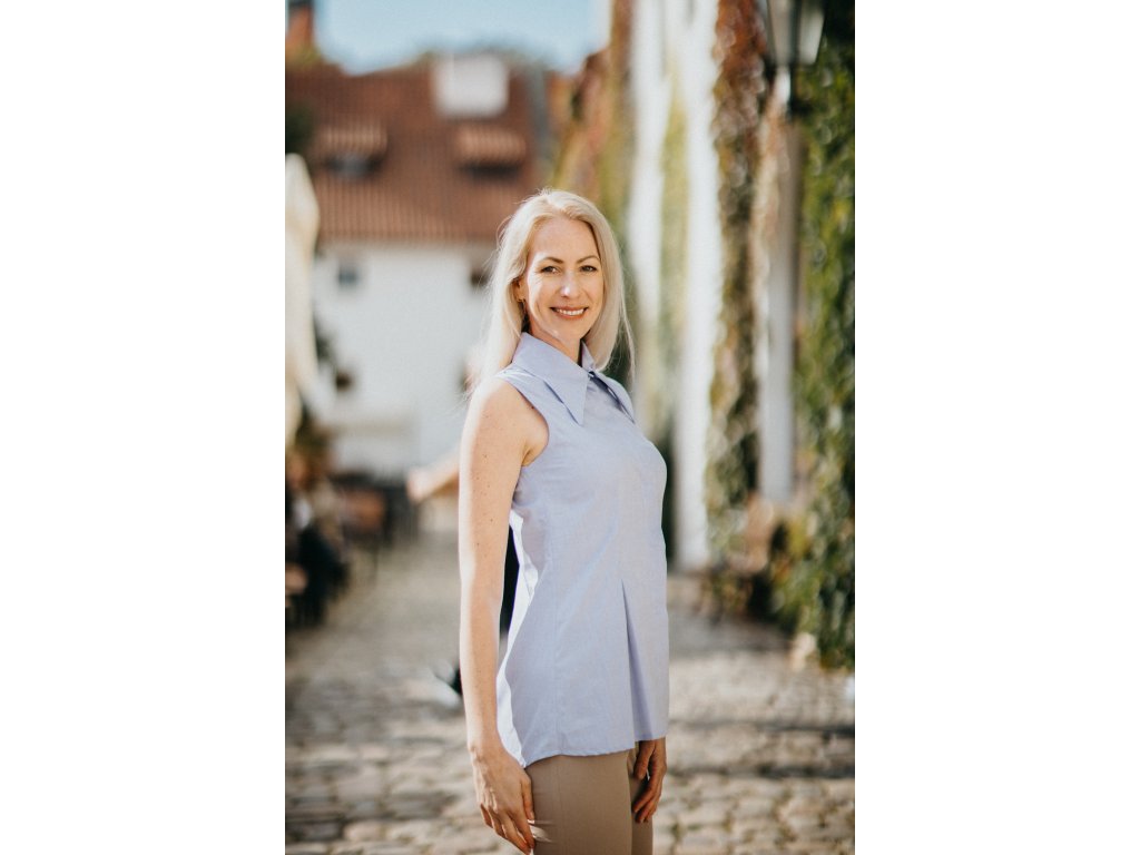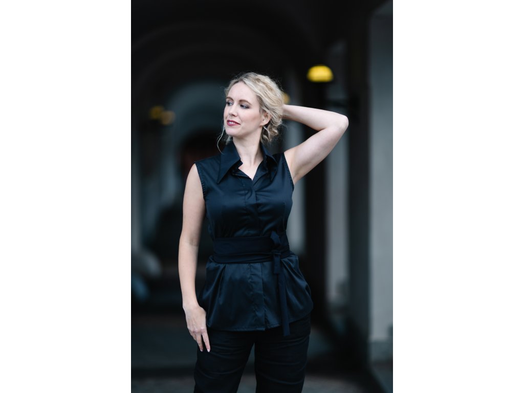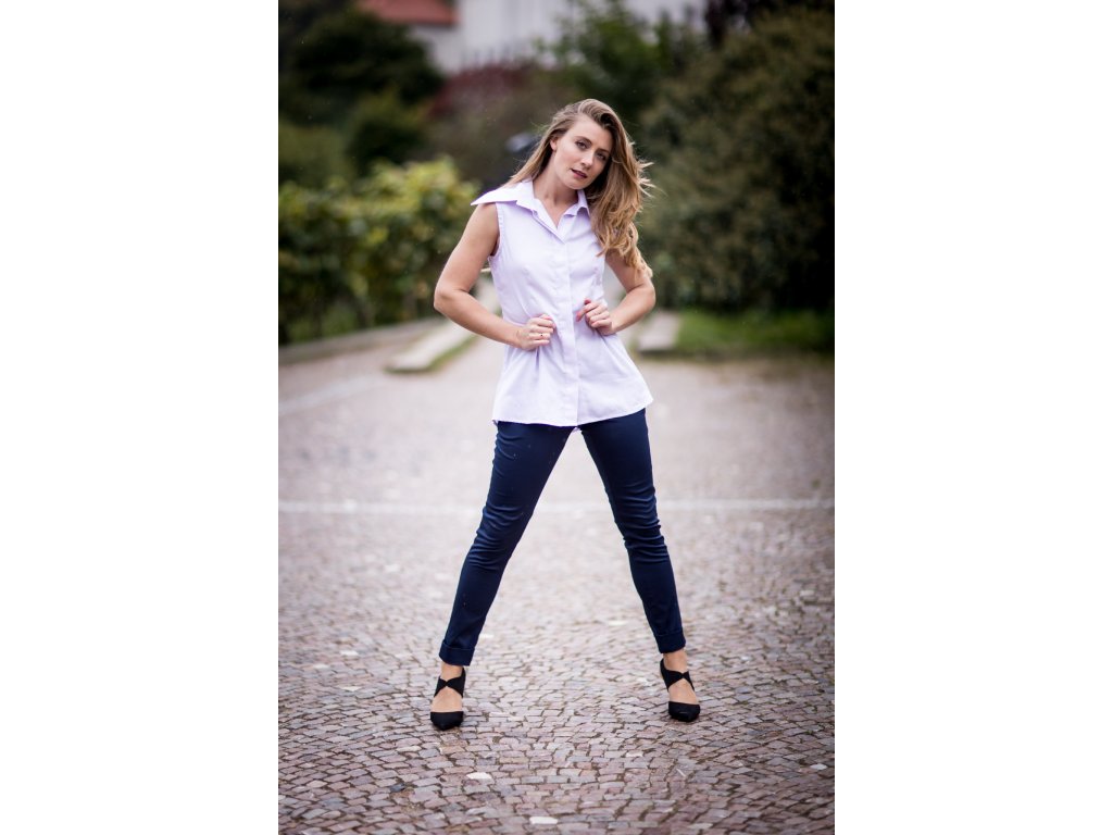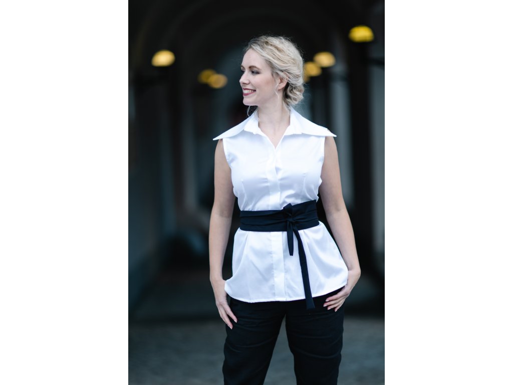 Elegantní delší projmutá halenka se skrytým zapínáním a širokým límcem. Poslední knoflíček je křišťálový. Rukávy jsou dlouhé s manžetou, kterou lze uvázat na elegantní uzlík.