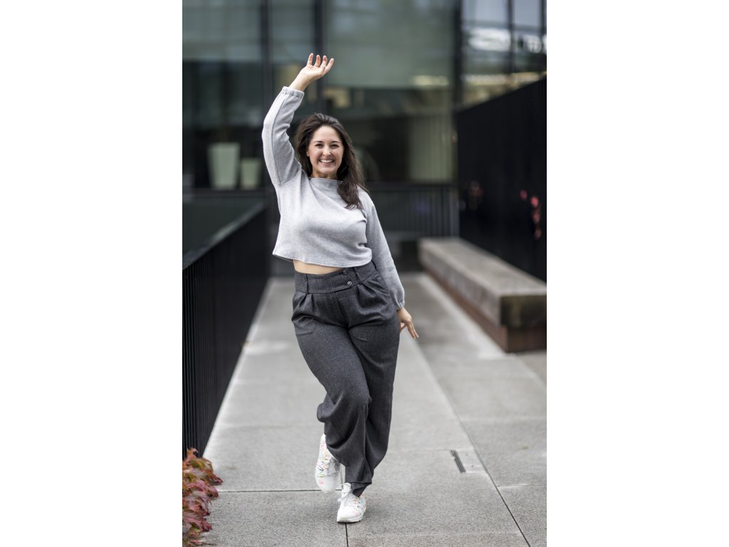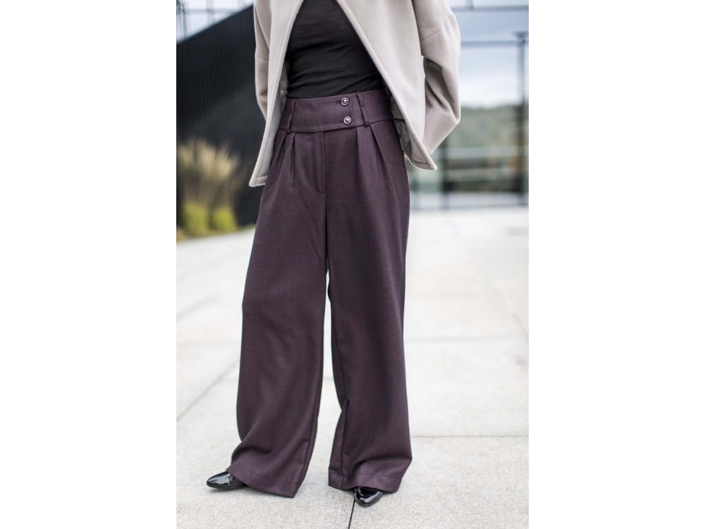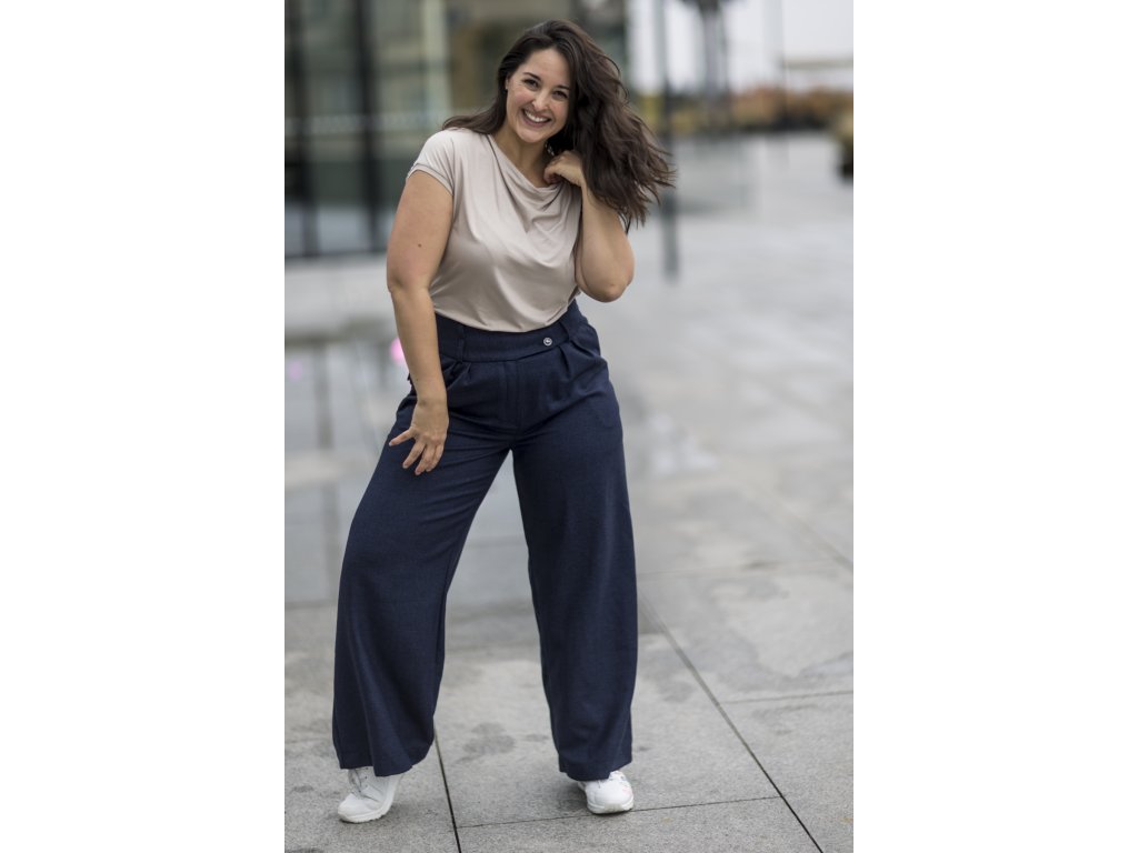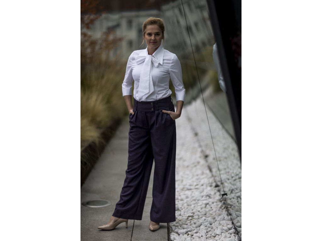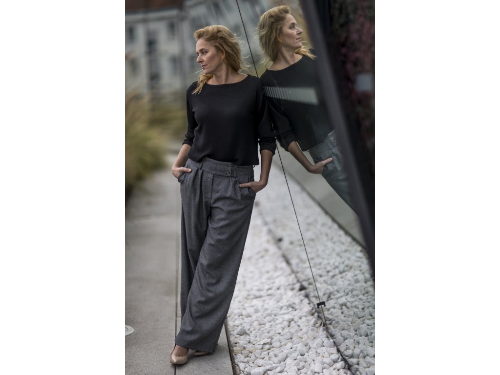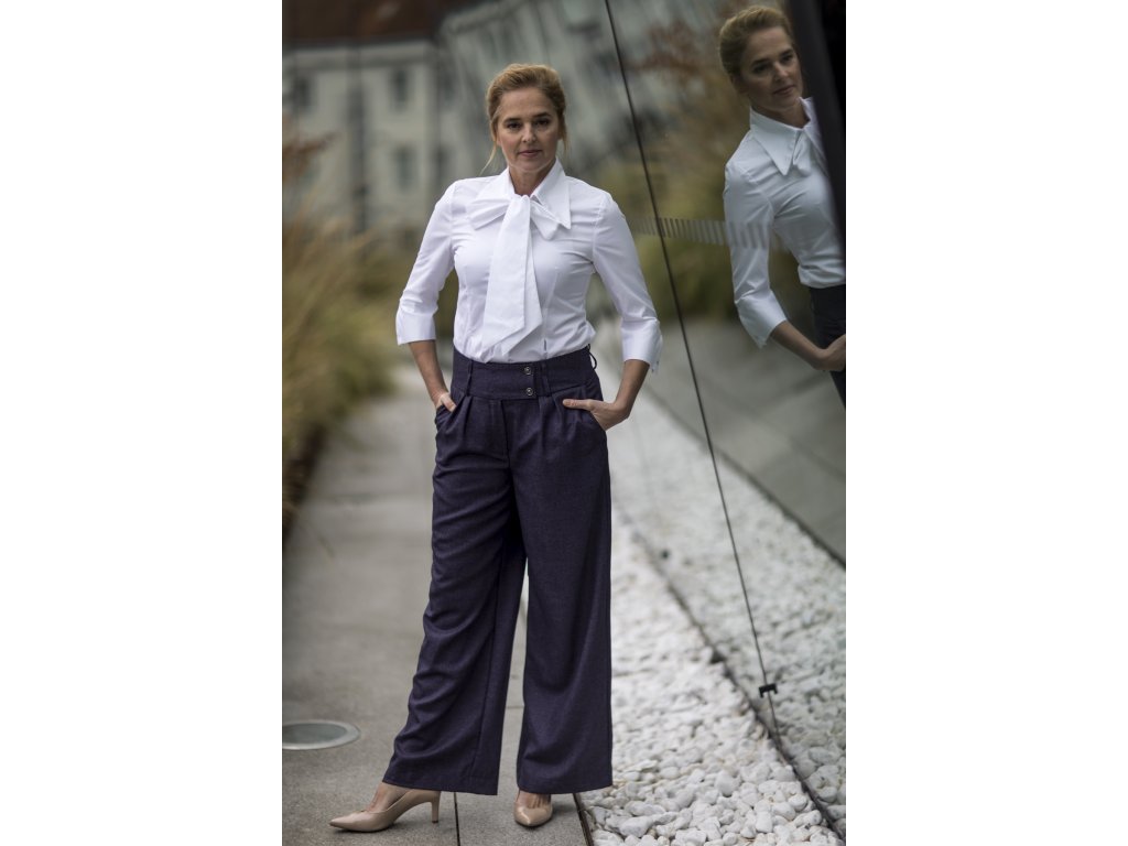 Elegantní kalhoty se širšími nohavicemi, které podtrhnou Vaši ženskost. Kalhoty můžete doplnit do kostýmku kabátkem ze stejného materiálu ve stejné nebo jiné barevné kombinaci. S kostýmkem zazáříte nejen na důležitých schůzkách, ale klidně i večer na vernisáži nebo v divadle...stačí trochu pozměnit doplňky...např. vyměnit klasickou košili za hedvábnou šantungovou halenku :)