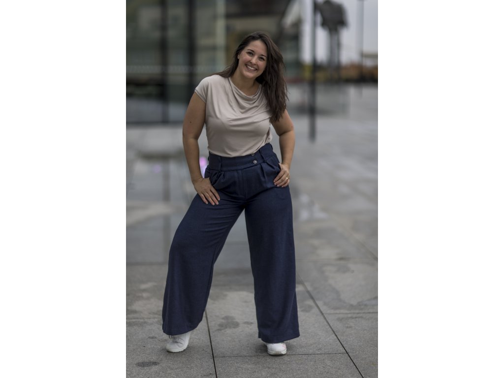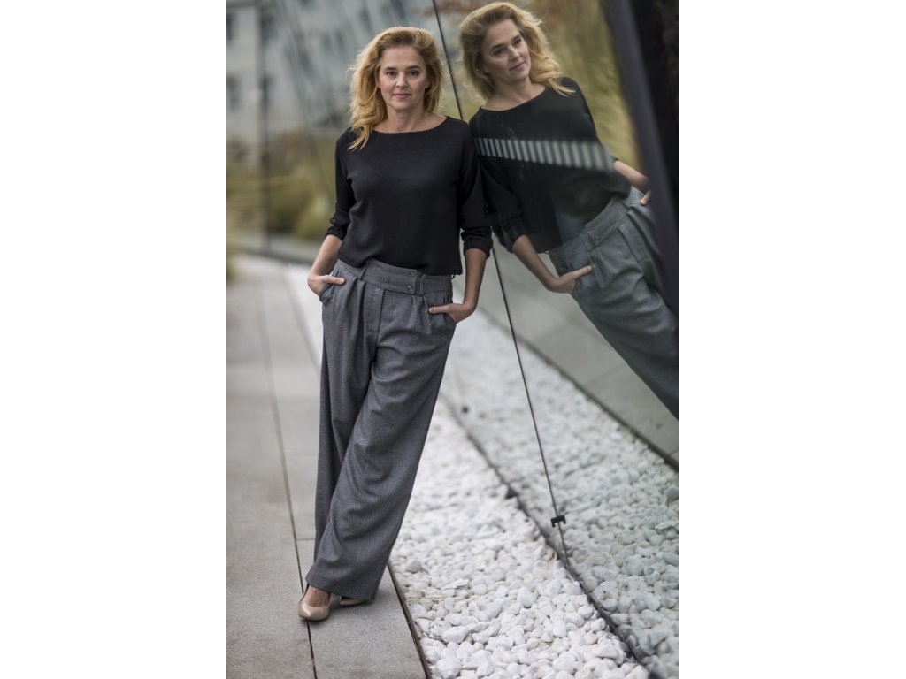 Elegantní kalhoty se širšími nohavicemi, které podtrhnou Vaši ženskost. Kalhoty můžete doplnit do kostýmku kabátkem ze stejného materiálu ve stejné nebo jiné barevné kombinaci. S kostýmkem zazáříte nejen na důležitých schůzkách, ale klidně i večer na vernisáži nebo v divadle...stačí trochu pozměnit doplňky...např. vyměnit klasickou košili za hedvábnou šantungovou halenku :)
