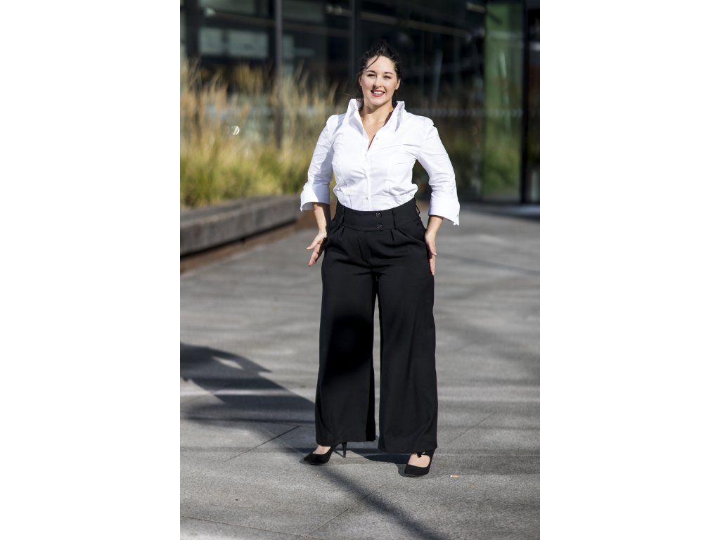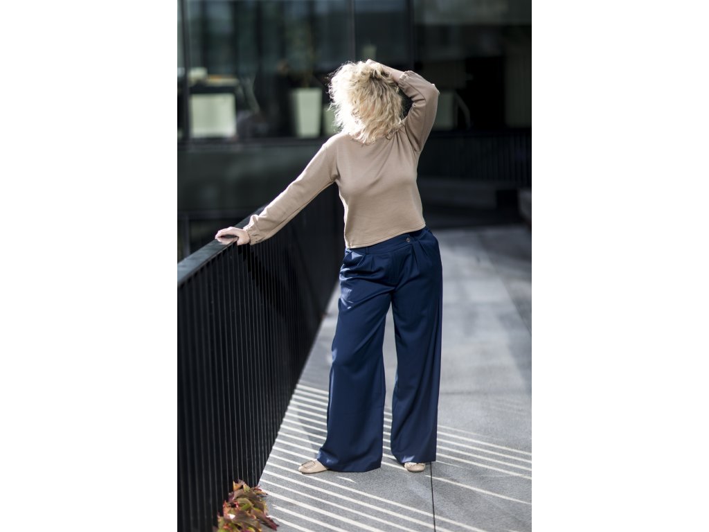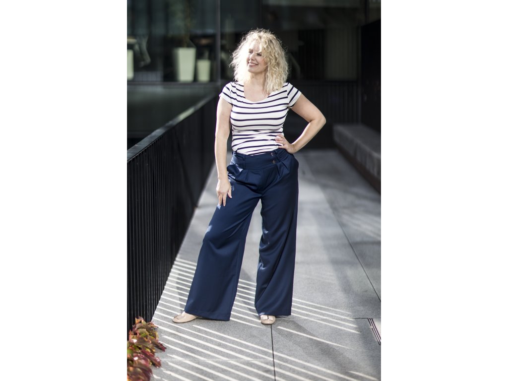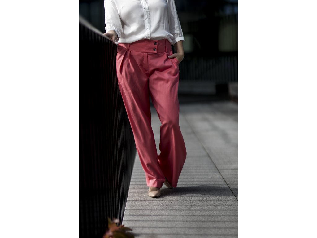 Elegantní kalhoty se širšími nohavicemi, které podtrhnou Vaši ženskost. Kalhoty můžete doplnit do kostýmku kabátkem ze stejného materiálu ve stejné nebo jiné barevné kombinaci. S kostýmkem zazáříte nejen na důležitých schůzkách, ale klidně i večer na vernisáži nebo v divadle...stačí trochu pozměnit doplňky...např. vyměnit klasickou košili za hedvábnou šantungovou halenku :)