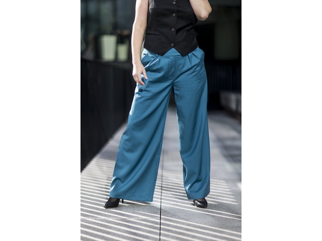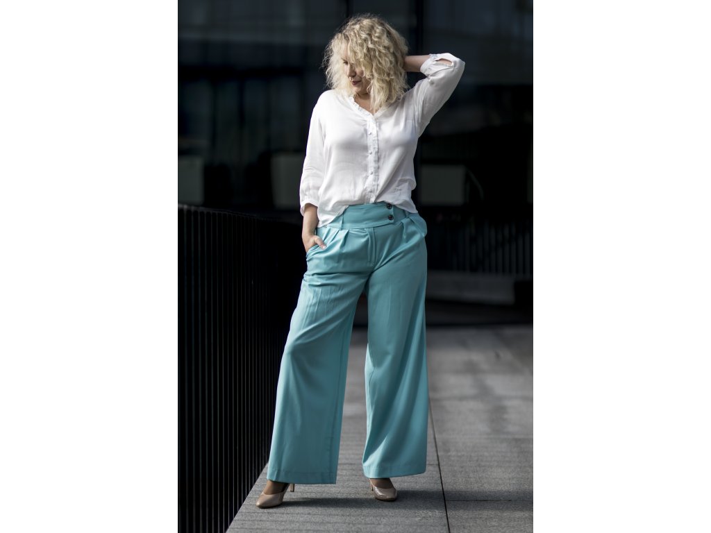 Elegantní kalhoty se širšími nohavicemi, které podtrhnou Vaši ženskost. Kalhoty můžete doplnit do kostýmku kabátkem ze stejného materiálu ve stejné nebo jiné barevné kombinaci. S kostýmkem zazáříte nejen na důležitých schůzkách, ale klidně i večer na vernisáži nebo v divadle...stačí trochu pozměnit doplňky...např. vyměnit klasickou košili za hedvábnou šantungovou halenku :)