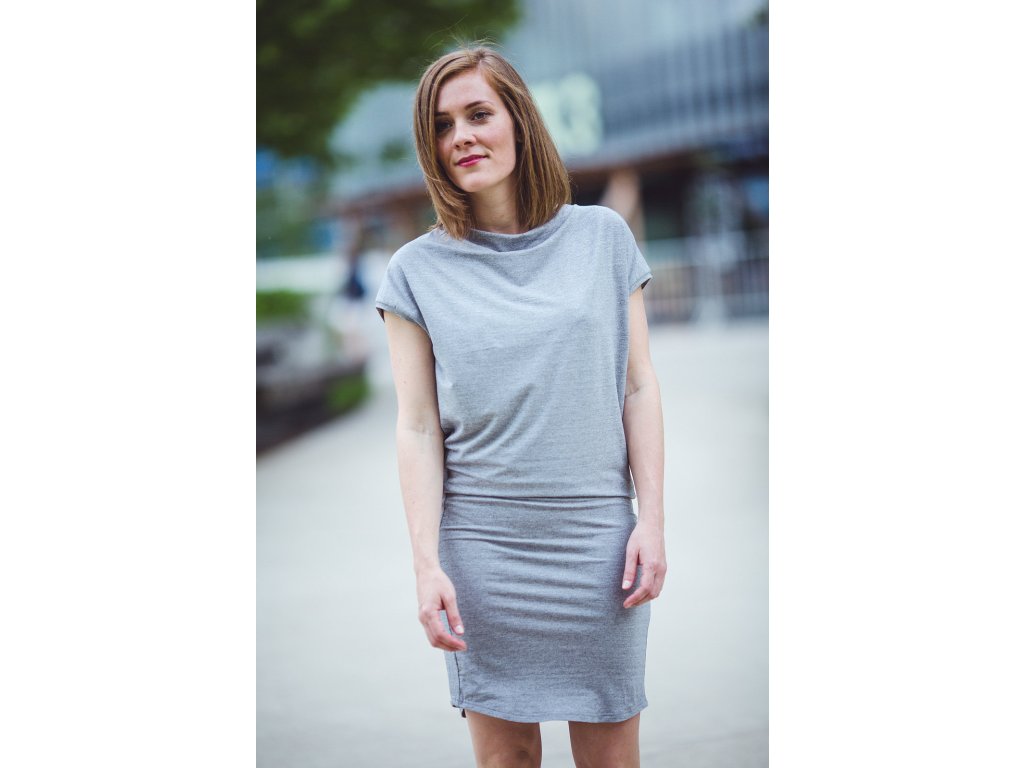 Šedě melírované šaty s krátkým rukávem a volného střihu, který skvěle padne. Budou Vám slušet jak podkasané, tak i s páskem (viz foto).