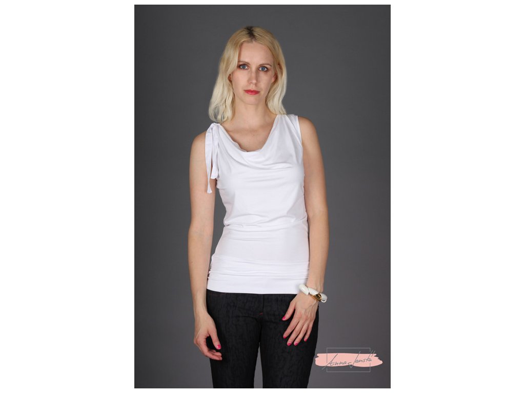 Velmi příjemné tmavě modré tílko se saténovou nebo šifonovou stužkou, kterou buď můžete nebo nemusíte použít jako elegantní doplněk (lze ji jednoduše odvázat). Barvu stužky je možné změnit, příp. můžete dokoupit další stužku (za příplatek 60 Kč). Stužku perte zvlášť (ručně). Tílko má výstřih typu "spadlá voda" a na bocích dvojitý náplet, který je po obou stranách nařasen gumičkou (všitou do nápletu).
